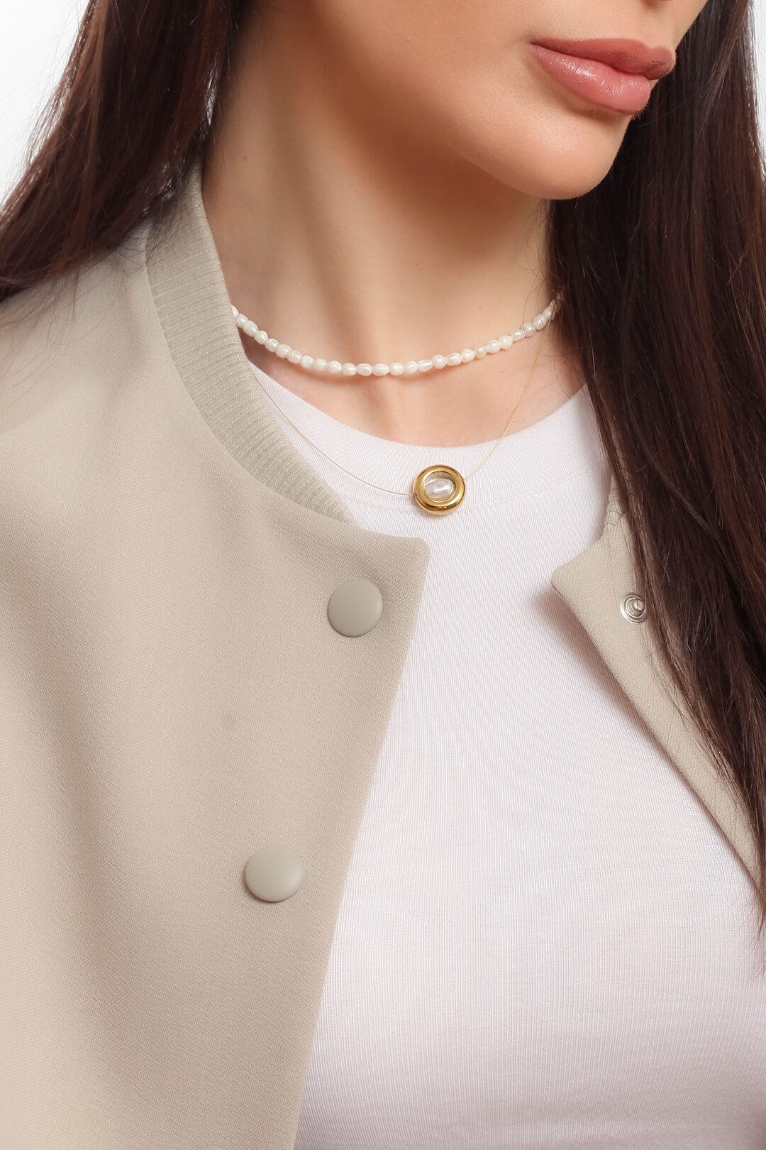 Κολιέ αιματίτης με πέρλα — καθαρές γραμμές, διακριτική λάμψη.