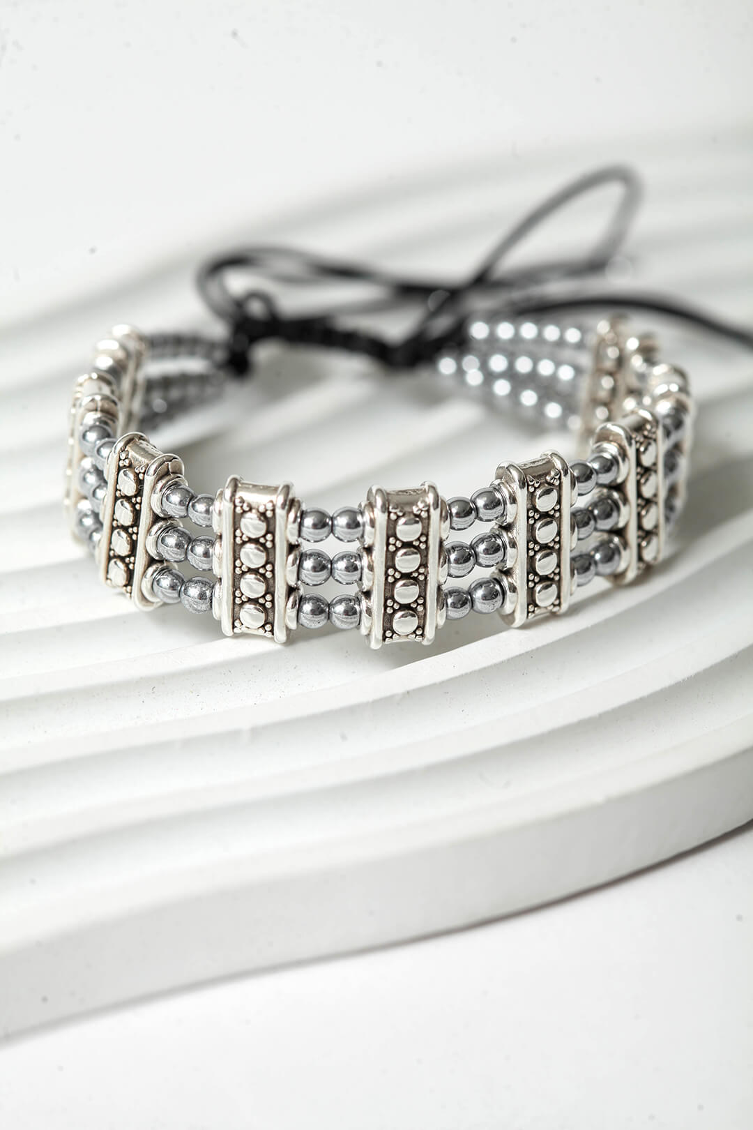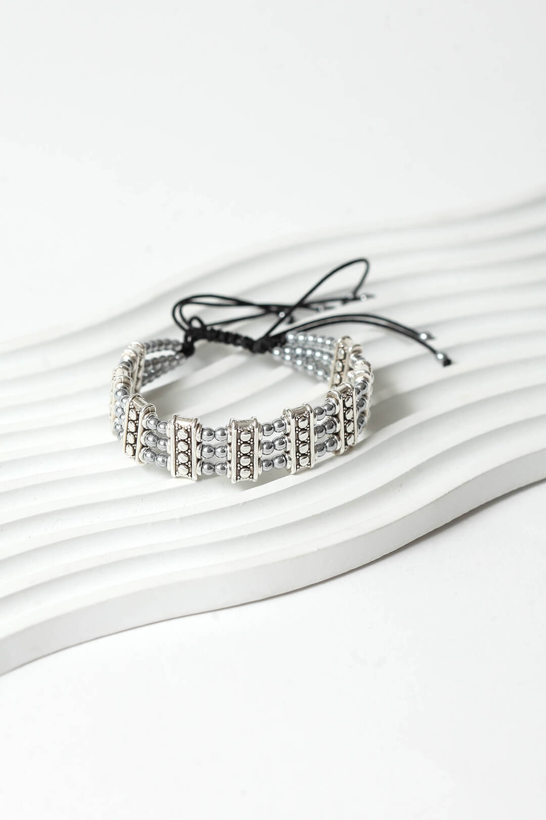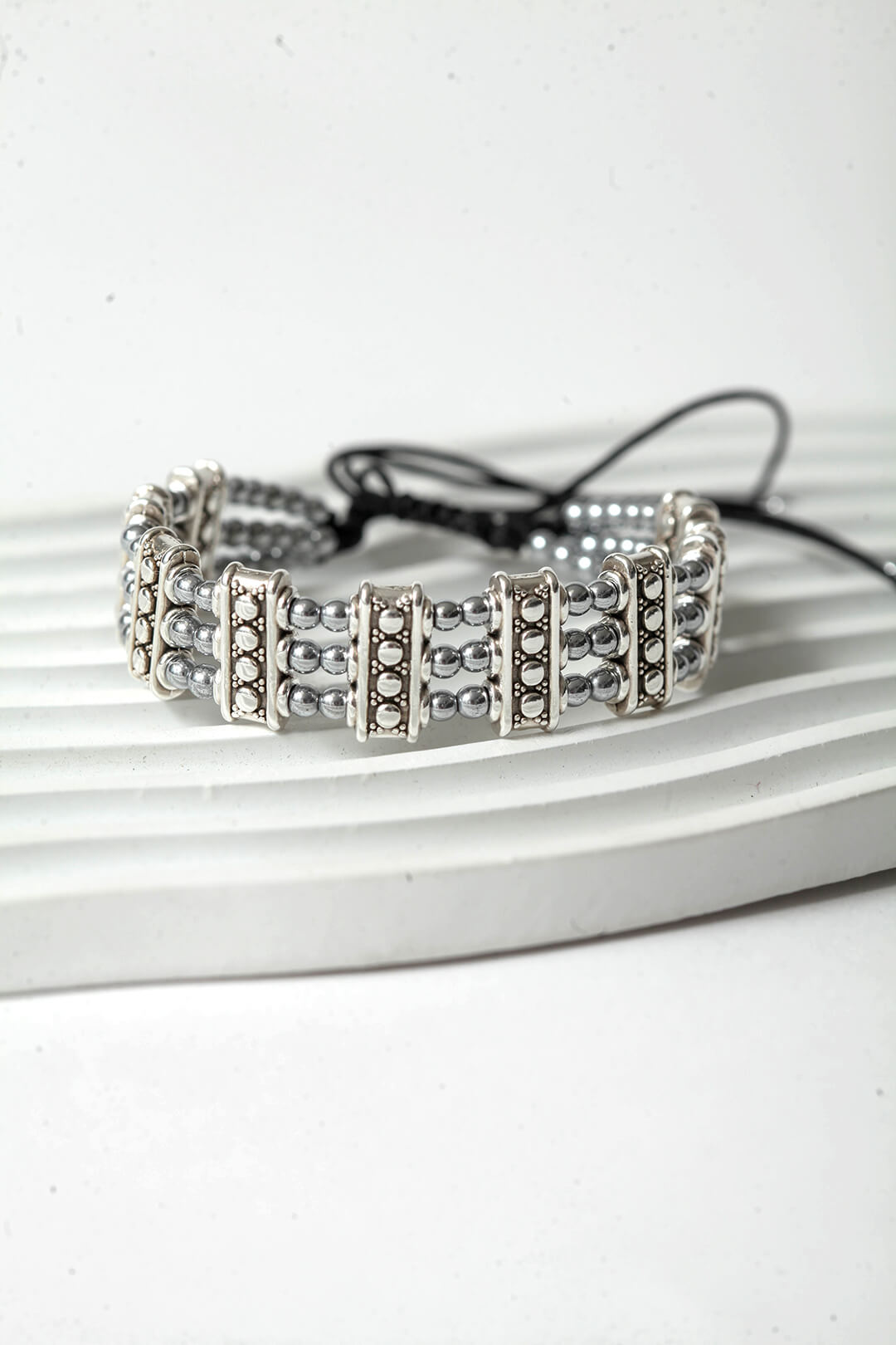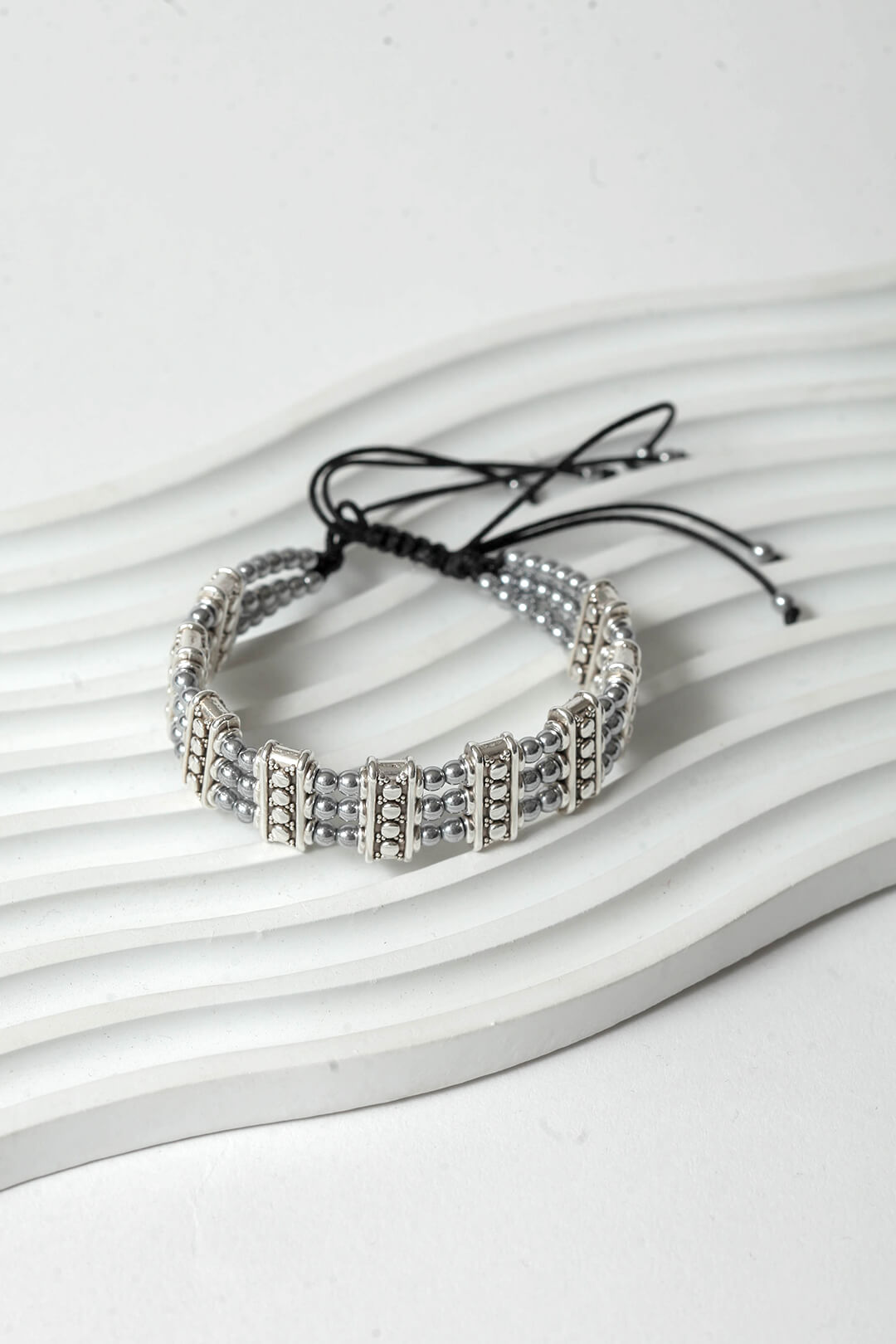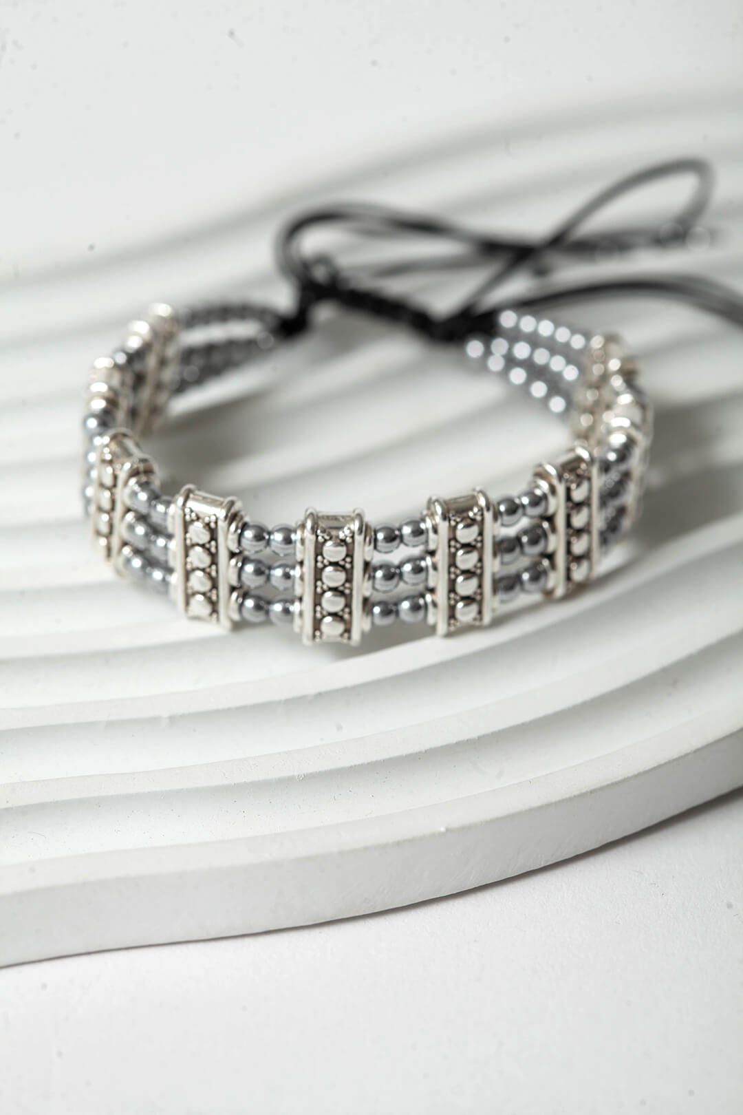 Οι στρογγυλές χάντρες φυσικού αιματίτη με τη βελούδινη μεταλλική τους λάμψη αγκαλιάζουν τον καρπό με έναν τρόπο που είναι ταυτόχρονα διακριτικός και εντυπωσιακός.Κλασικό αλλά όχι βαρετό, γιατί η αληθινή κομψότητα δεν εξαρτάται από την περίσταση.